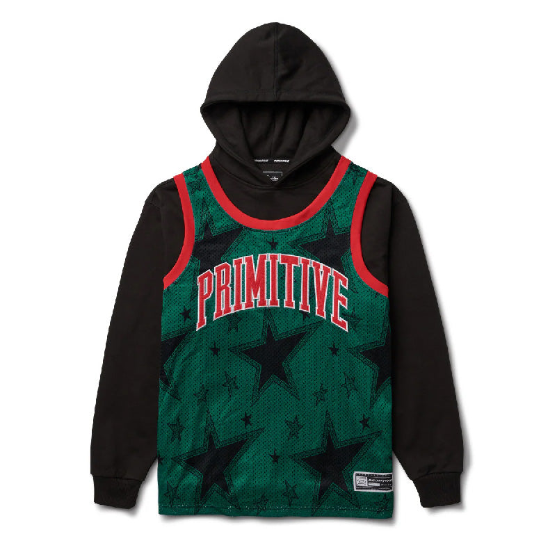 Este híbrido de hoodie y camiseta tipo jersey combina lo mejor de dos mundos: estilo deportivo y comodidad urbana. La capa superior está hecha en malla 100% poliéster con un estampado sublimado de estrellas en verde y negro, mientras que la capa inferior es de felpa pesada (80% algodón / 20% poliéster) para máxima calidez. Lleva el logo “Primitive” en aplique personalizado al frente, puños y pretina acanalados en la capucha, además de una etiqueta tejida exclusiva. Perfecto para patinar, salir o destacar en cualquier outfit. 🛹✨